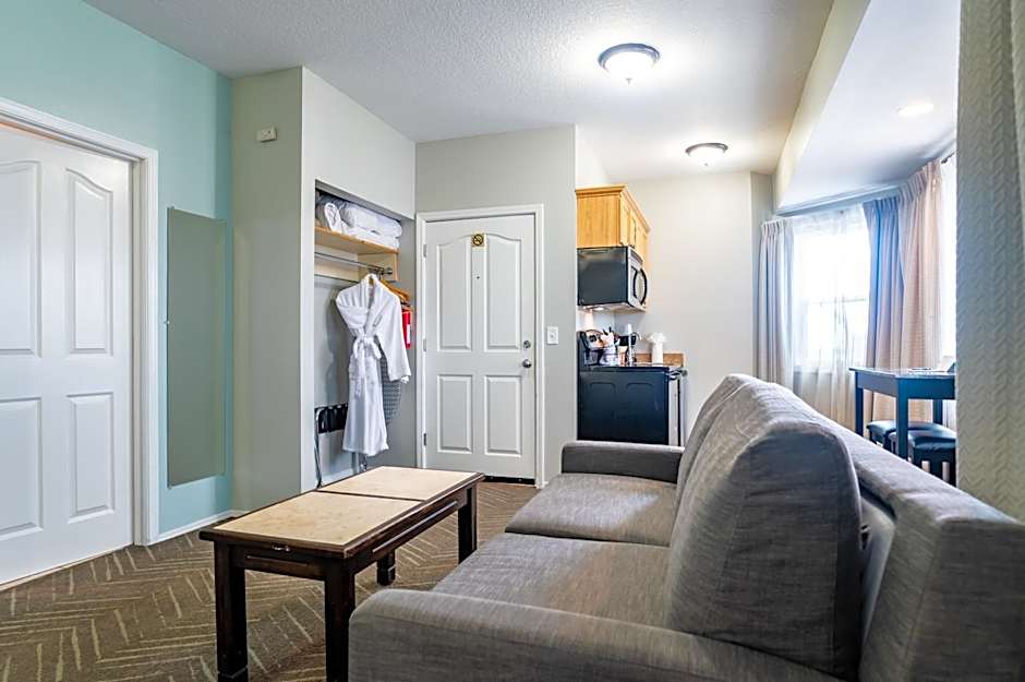 This spacious suite includes a fireplace, flat-screen TV and a sofa bed. A microwave, small refrigerator, coffeemaker and toaster are also provided, as is a 2-person jetted tub. Bathrobes are available.